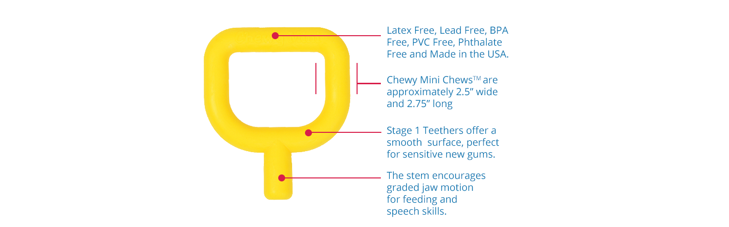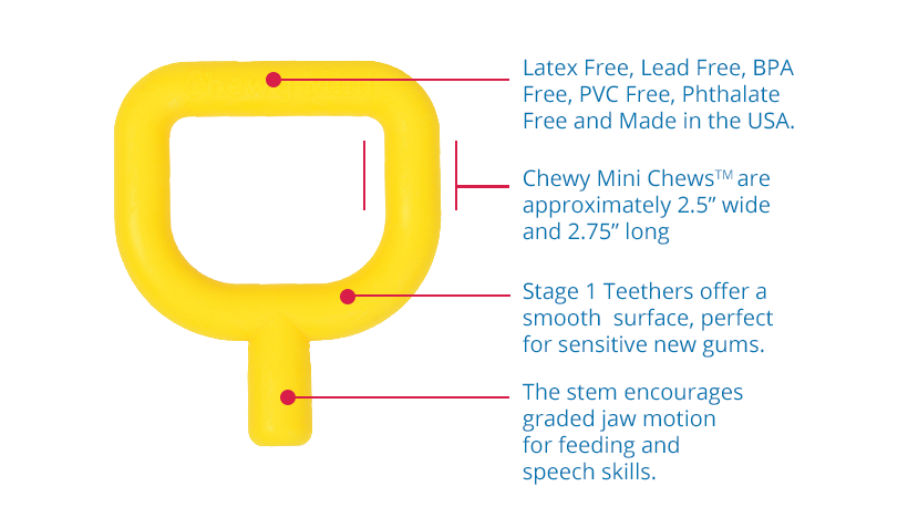 Chewy Mini ChewsTM are perfect for little ones to organize and learn new biting and chewing skills. This first teether offers a smooth flexible surface for new gums. Biting on Mini ChewsTM allows the mouth to remain open for breathing and sound play. The fun closed loop handle is easily grasped by little fingers.