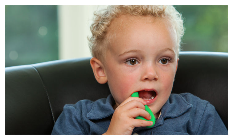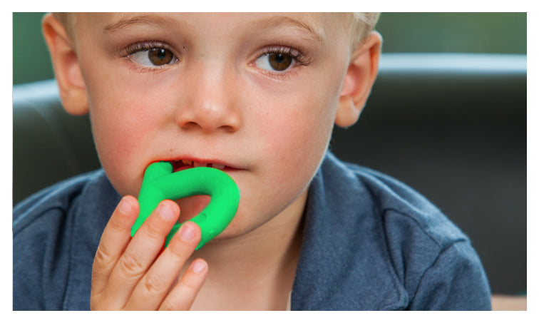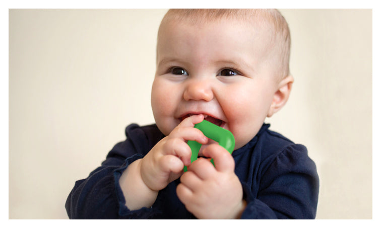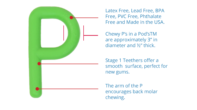 These two fun green Chewy P's offer a smooth flexible surface perfect for new gums and sprouting teeth to practice biting and chewing skills. Grasping the top of the P supports the development of early fine motor skills for little fingers. The long arm of the P reaches back to the molar area to provide jaw input where true biting skills mature. Teething on Chewy P's allows the mouth to remain open for breathing and sound play!