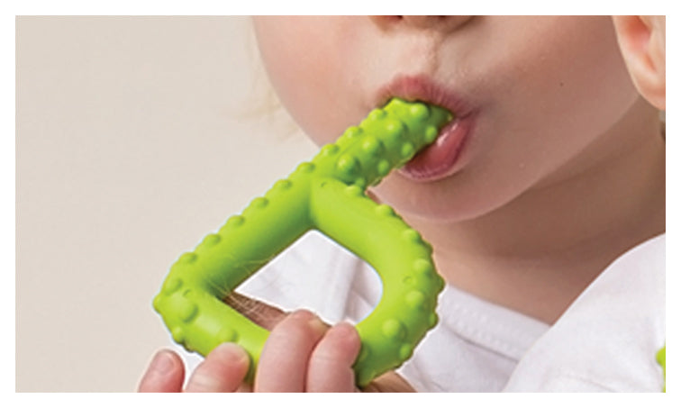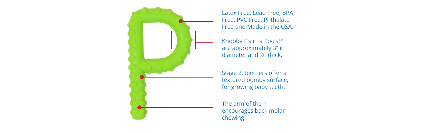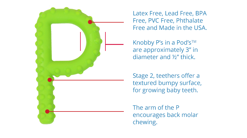 These two fun green Chewy P's offer a bumpy surface perfect for sprouting teeth to practice biting, chewing, and speech skills. Grasping the top of the P supports the development of early fine motor skills for little fingers. The long arm of the P reaches back to the molar area to provide jaw input where true biting skills mature. Teething on Chewy P's allows the mouth to remain open for breathing and sound play!