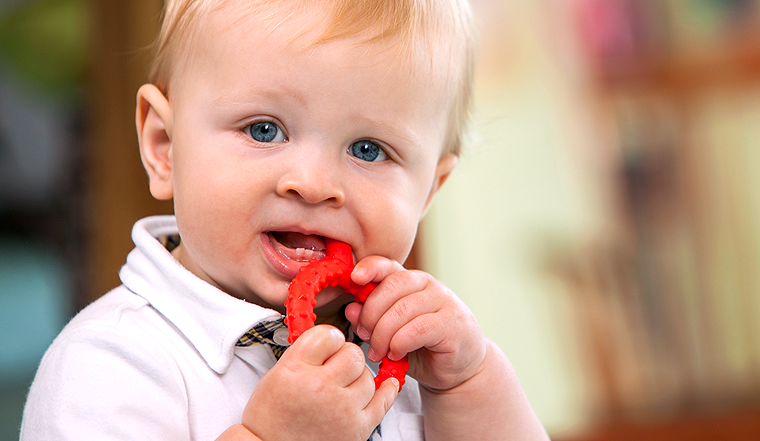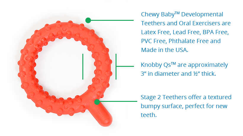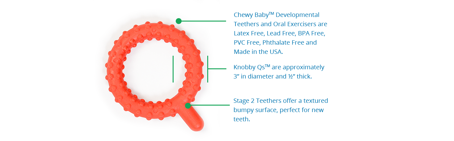 Each Knobby Q™ offers a flexible and bumpy surface, perfect for new teeth getting ready to start chewing foods. Knobby Q™ teethers leave the mouth open for breathing and sound play and are easily grasped by little fingers.