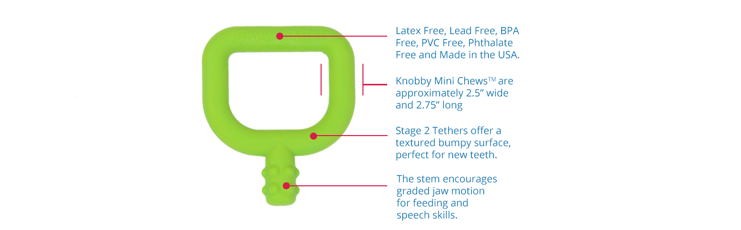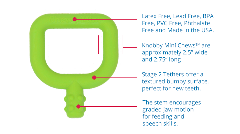 Knobby Mini Chews™ are perfect for little ones to organize and learn new biting and chewing skills. This first teether offers a smooth flexible surface for new gums. Biting on Mini Chews™ allows the mouth to remain open for breathing and sound play. The fun closed loop handle is easily grasped by little fingers.