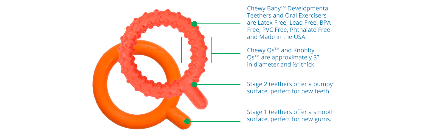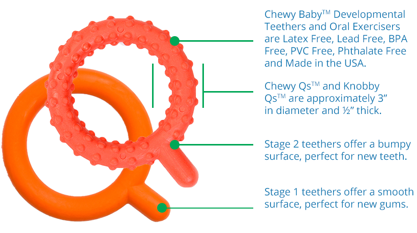 Chewy QsTM and Knobby QsTM encourage proper jaw motion needed for developing biting, chewing, and important speech skills